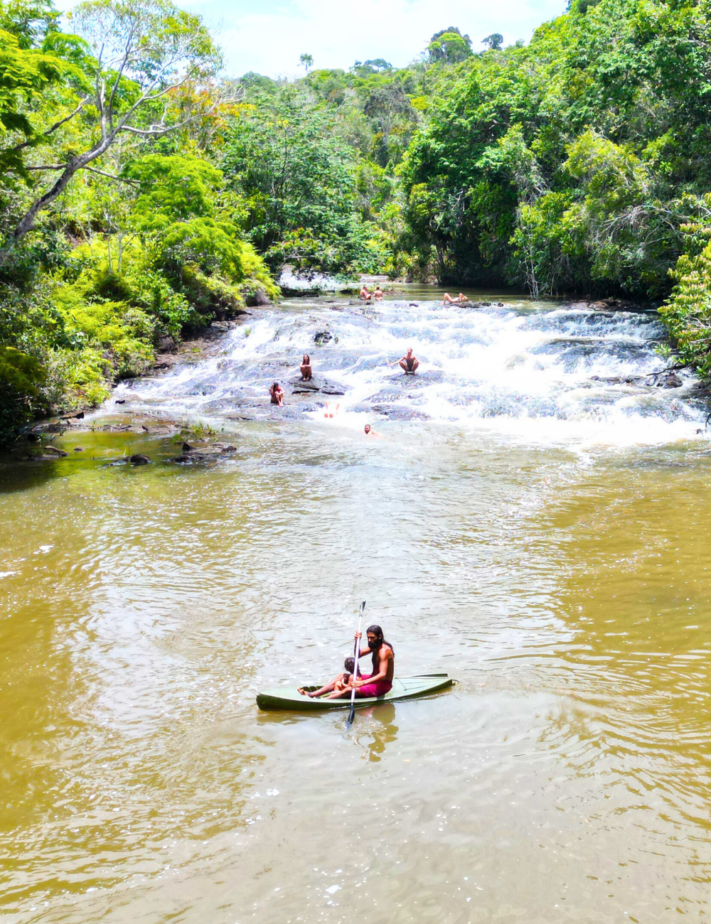 É um banho com plantas medicinais sagradas, que inclui a vaporização, na beira da cachoeira, que traz a purificação, alinhamento e proteção do campo energético.